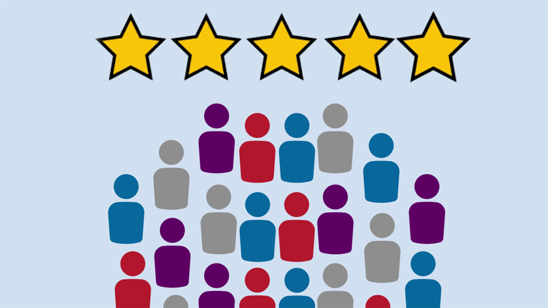 The people increase in numbers as the process icons are removed. A 5 star rating appears above the people to get all 5 stars filled. The people transition into a globe with a heart in the middle. |