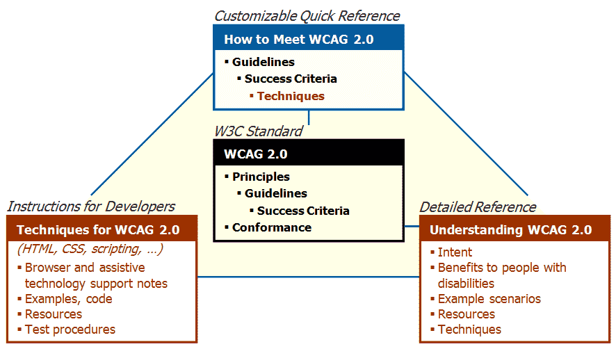 Kluczowym zasobem dla projektantów i programistów korzystających z WCAG 2 jest Jak spełnić WCAG 2 (Krótki przewodnik): Konfigurowalne szybkie odniesienie do wymagań WCAG 2 (kryteria sukcesu) i technik. Zawiera wszystkie wytyczne WCAG 2 i kryteria sukcesu. Zasadniczo jest to lista kontrolna WCAG 2.